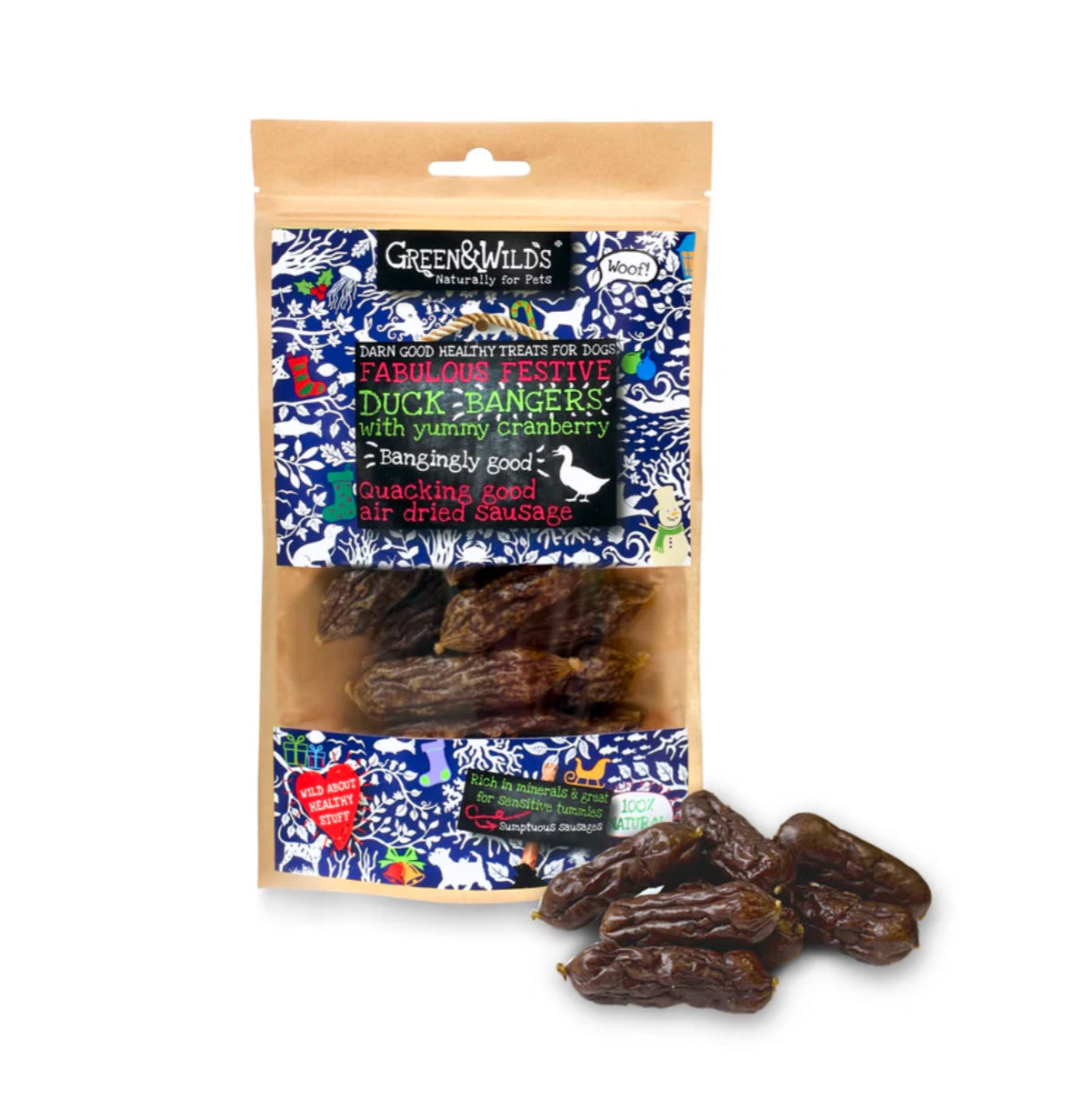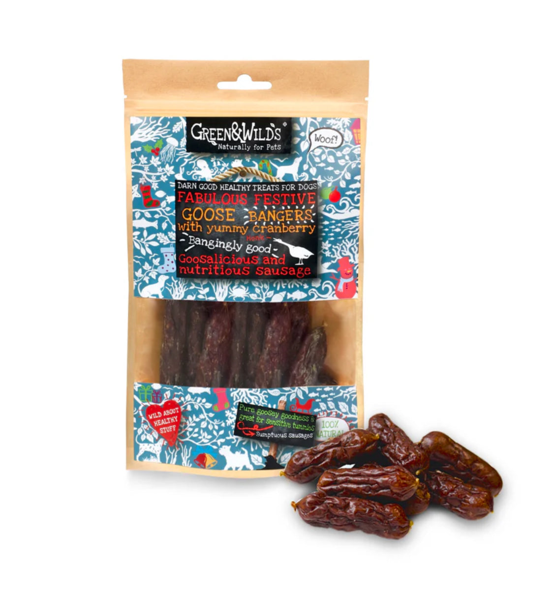 Mmmm sausages! Meaty, savoury sausages with added cranberry for a natural and nutritious festive treat.