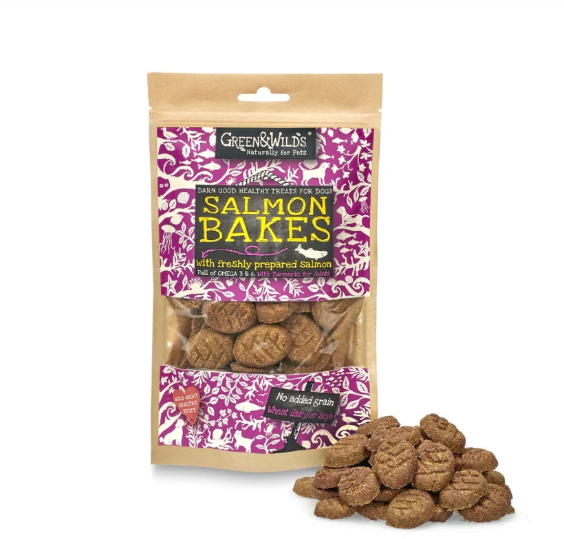 Baked in the rolling hills of England, our tasty salmon bakes are made with freshly prepared salmon, vegetables and turmeric. A great snack for any dog. High in Omega 3 and 6 for healthy skin and coat