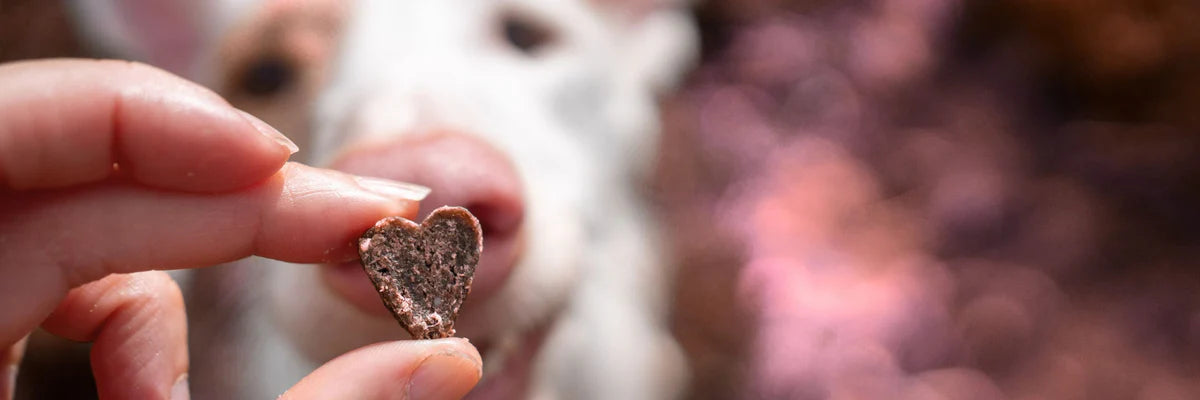 Our delicious heart-shaped treats with 60% British beef and strawberries. Perfect treats to show your dog how much you love them.