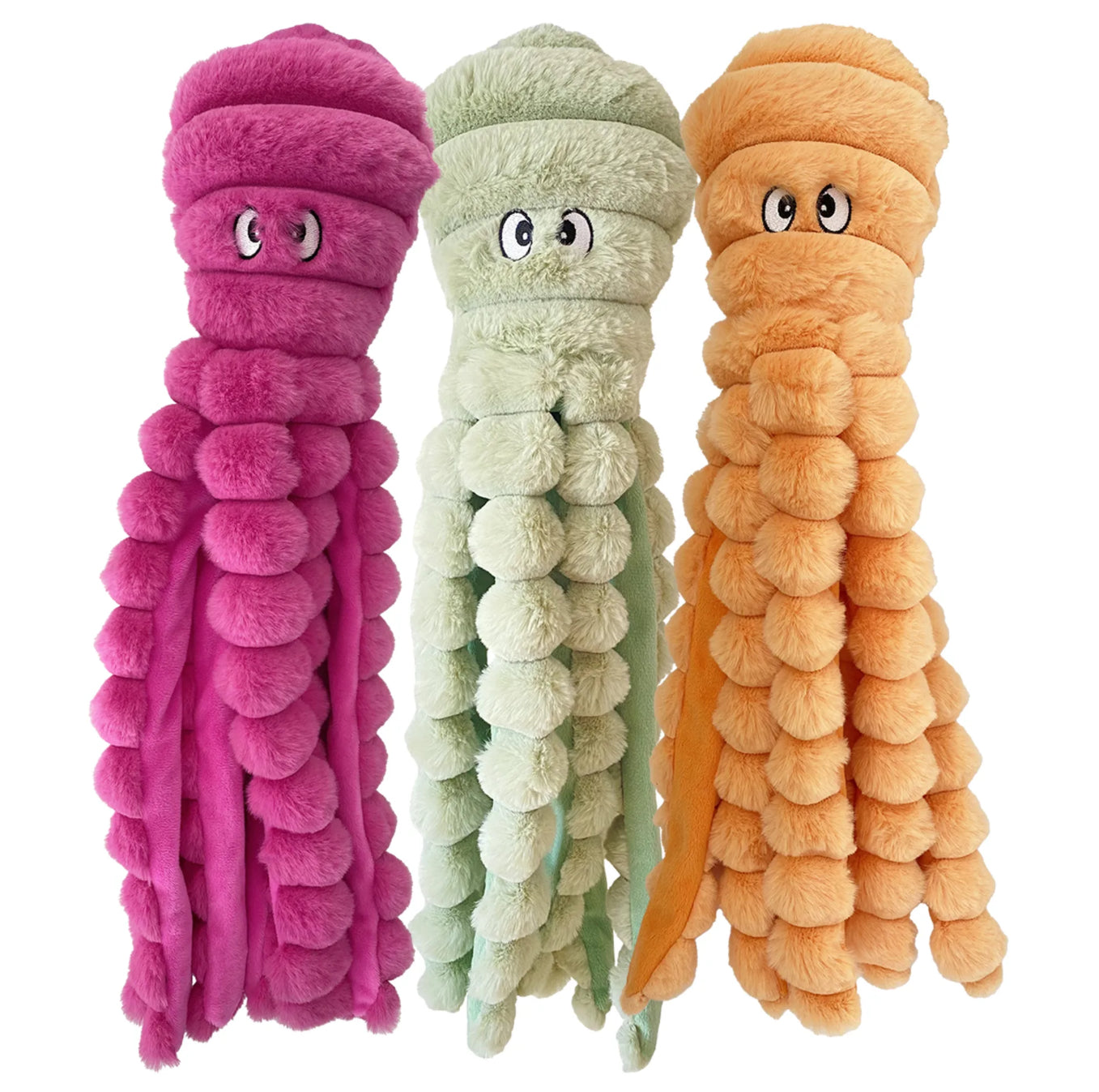 The octopuses have a crinkle noise in their tentacles and a large squeaker in their head for extra, extra fun and amusement!