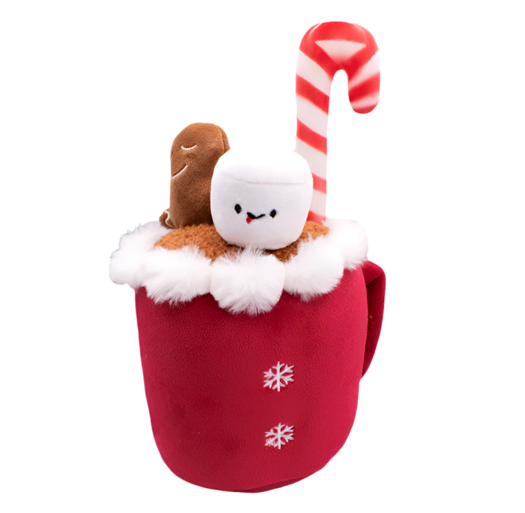 This festive plush coco mug is a perfect addition to your holiday celebrations. It features an interactive candy cane for your furry friend to tug on, along with a chewy candy cane and a fluffy gingerbread man.