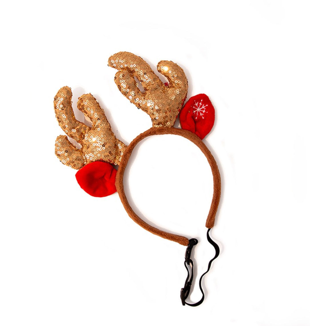 • Sparkly Reindeer Antlers - Adorable sparkly gold sequined antlers with cute red reindeer ears.