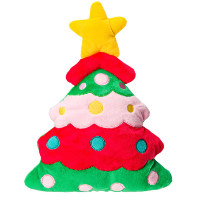 The soft plush toy is designed in a colorful Christmas tree shape, complete with a bright yellow star on top. Its tiered layers feature fun patterns of red, green, and pink, resembling cheerful ornaments. The toy includes an exciting squeaker inside, ensuring hours of interactive and engaging festive playtime.