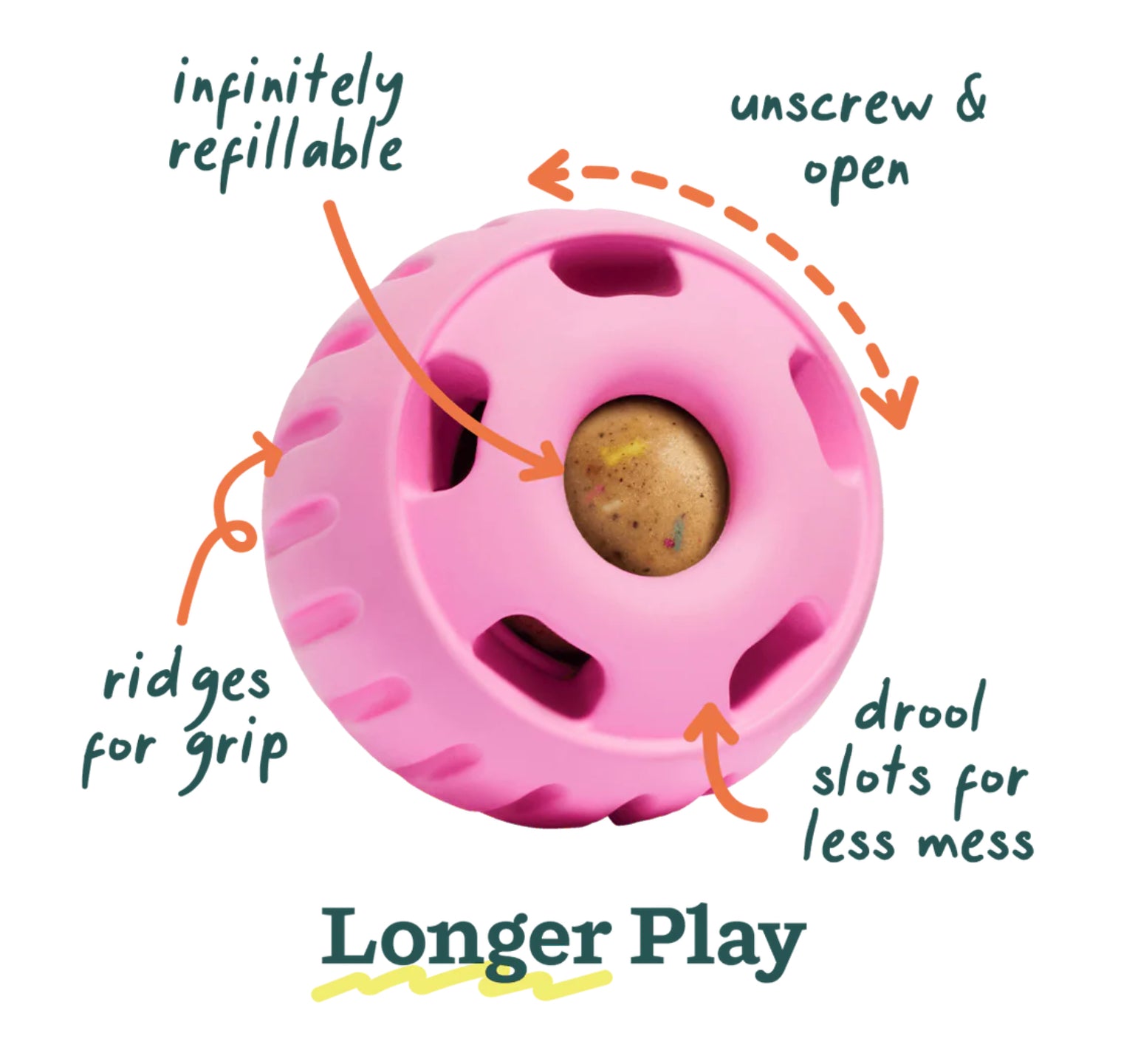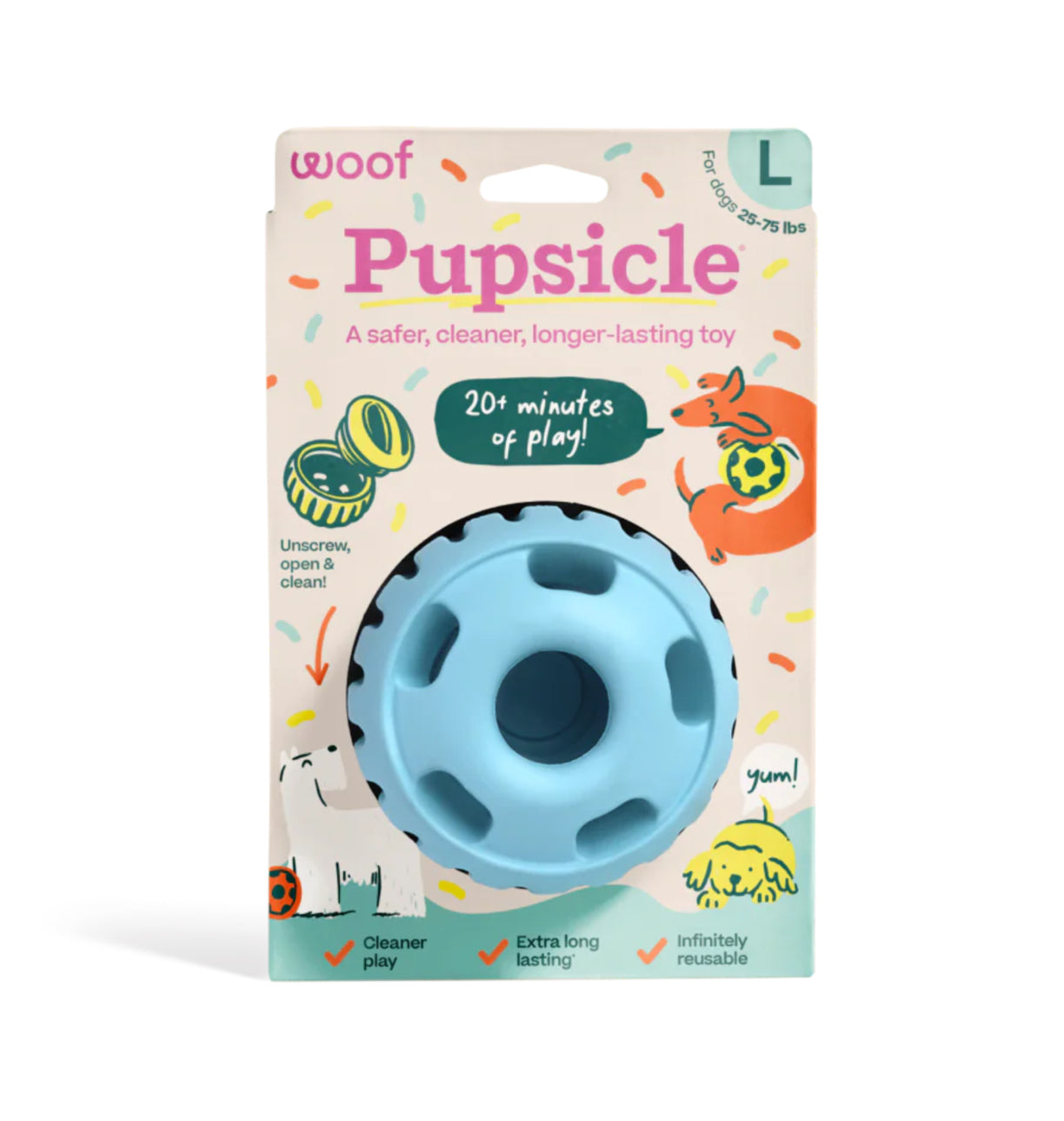 Simply fill the Woof Treat Tray with your pup’s favourite treats, freeze, and insert into the toy for your pup to lick away and soothe any anxiety. Try the Woof Pop Refills for longer lasting licking playtime. Built from extra-durable, non-toxic natural rubber, this toy has been innovatively designed to catch your pup's drool for a mess-free experience, plus, it's top rack dishwasher-safe!